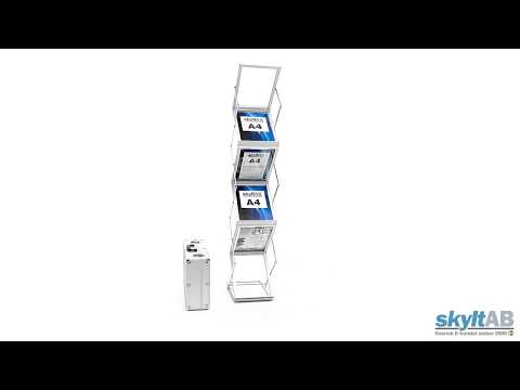 Det här broschyrstället är hopfällbart och tillverkat av aluminium och akrylskivor, vilket gör det både robust och enkelt att fälla ihop när det behövs. Dess dubbelsidiga design gör det möjligt att exponera dina trycksaker på bägge sidor och varje hyllplan rymmer upp till ca 20 mm material.