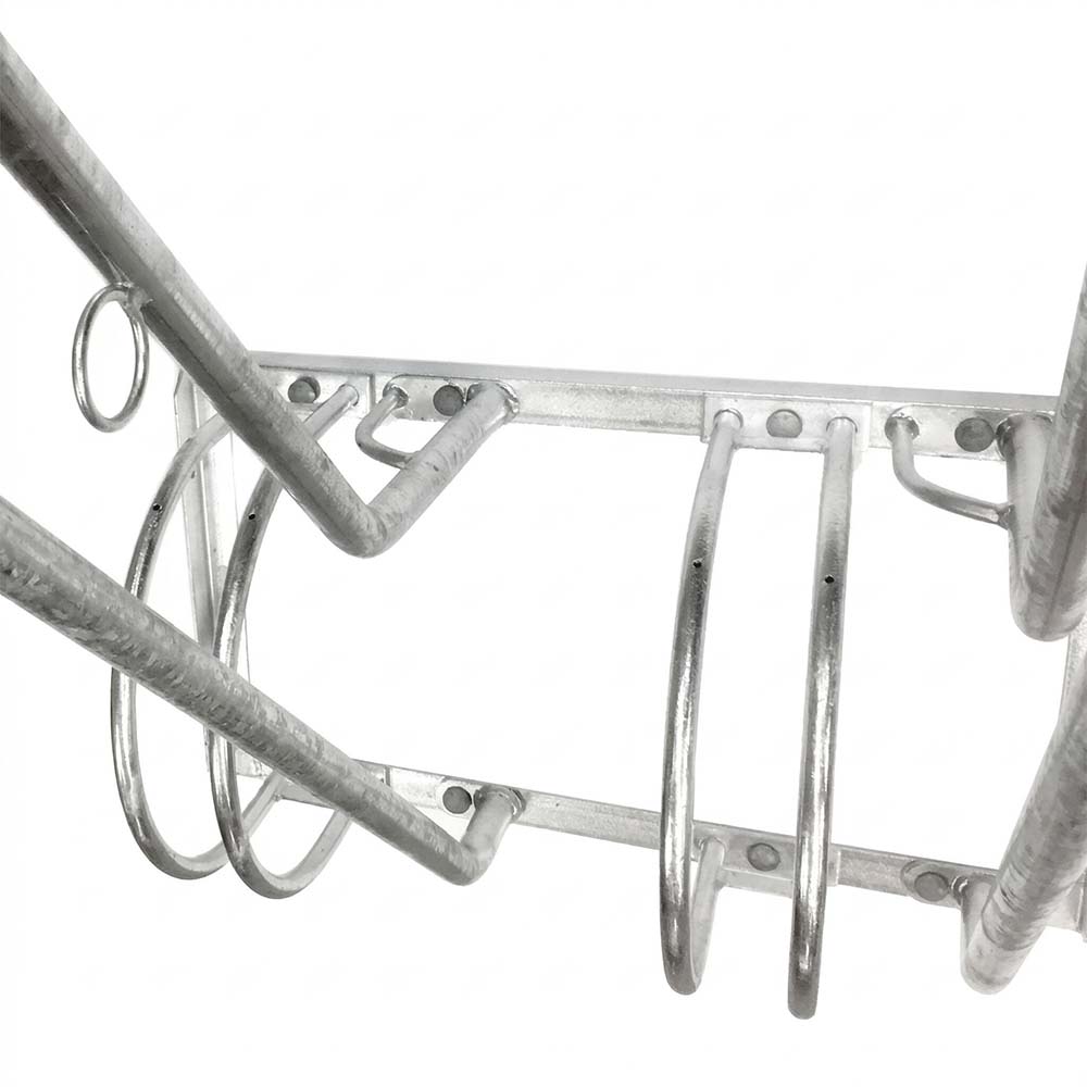 Vägghängt Cykelställ för 4 cyklar med låsbågar är designat för att vara hållbart och säkert. Detta är ett galvat cykelställ med stöldskydd och tillverkat i Europa för att hålla en extra hög kvalitet. Ett väggmonterat cykelställ med säkerhetsbågar är uppskattade där cykelstölder är vanliga och gör att cyklister kan låsa fast sin cykel i ramen vilket försvårar stöld.