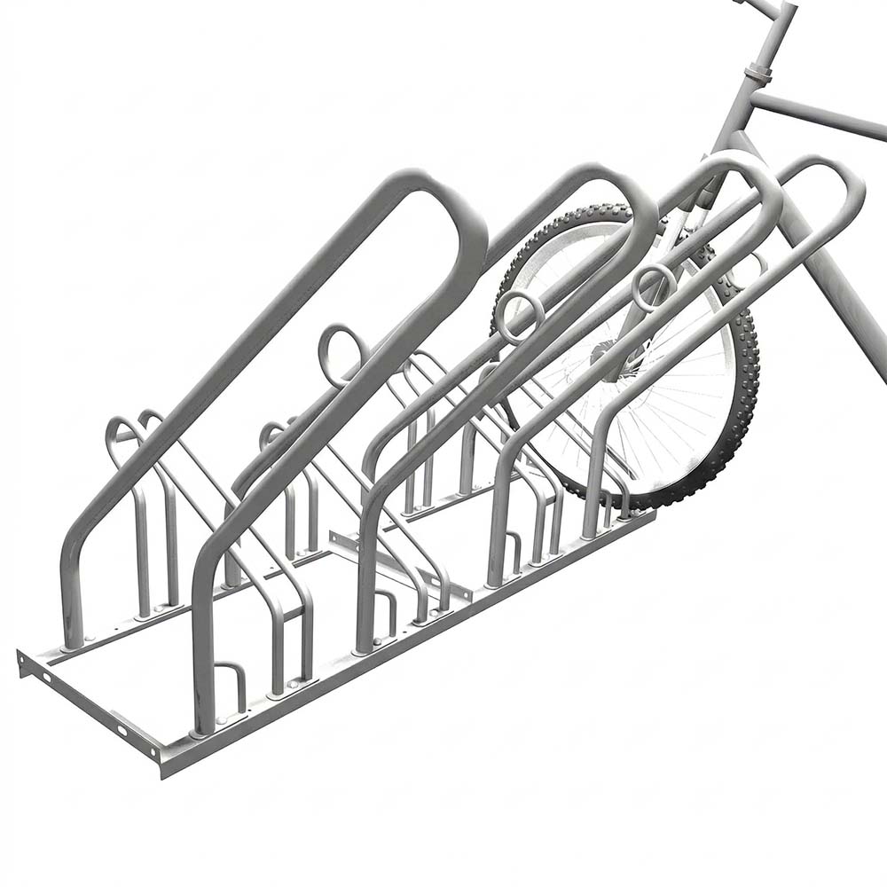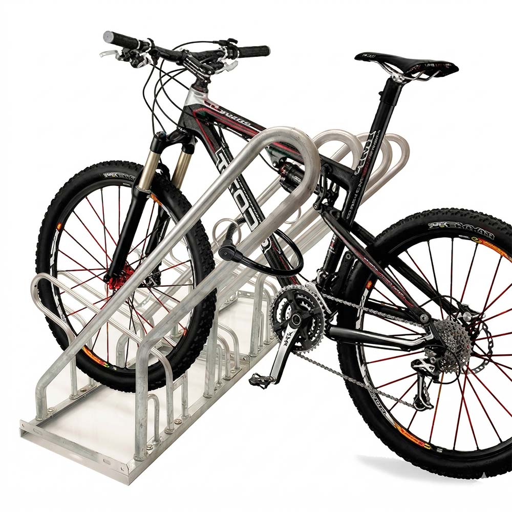 Cykelställ 4 Cyklar med låsbåge - Modell 250 är ett pålitligt cykelställ gjort av galvaniserat material och utrustat med en låsbåge för att säkerställa att cyklarna kan låsas fast. Detta är en mycket populär modell, särskilt lämplig för användning i offentliga miljöer eller platser där risken för cykelstölder är hög. Låsbågen bidrar till extra säkerhet och ramstödet ger ytterligare skydd mot eventuella skador på parkerade cyklar. Genom att låsa fast cyklarna i låsbågen försvåras det för tjuvar att stjäla dem.