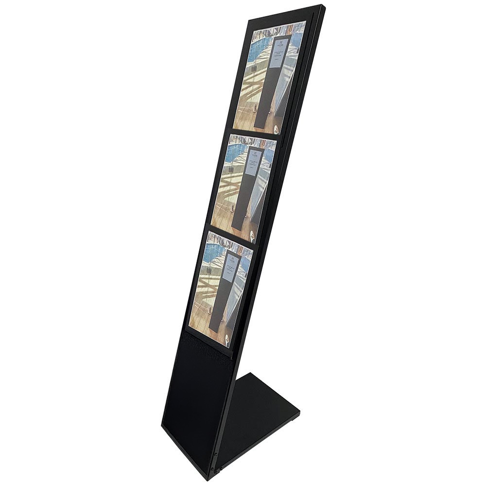 Detta skyltställ är tillverkat i pulverlackerat stål med god stabilitet och levereras med en A4 magnetram. Totalt finns plats för upp till fyra A4-ramar, vilket gör det lämpligt för exempelvis receptioner, utställningar och butiksmiljöer.