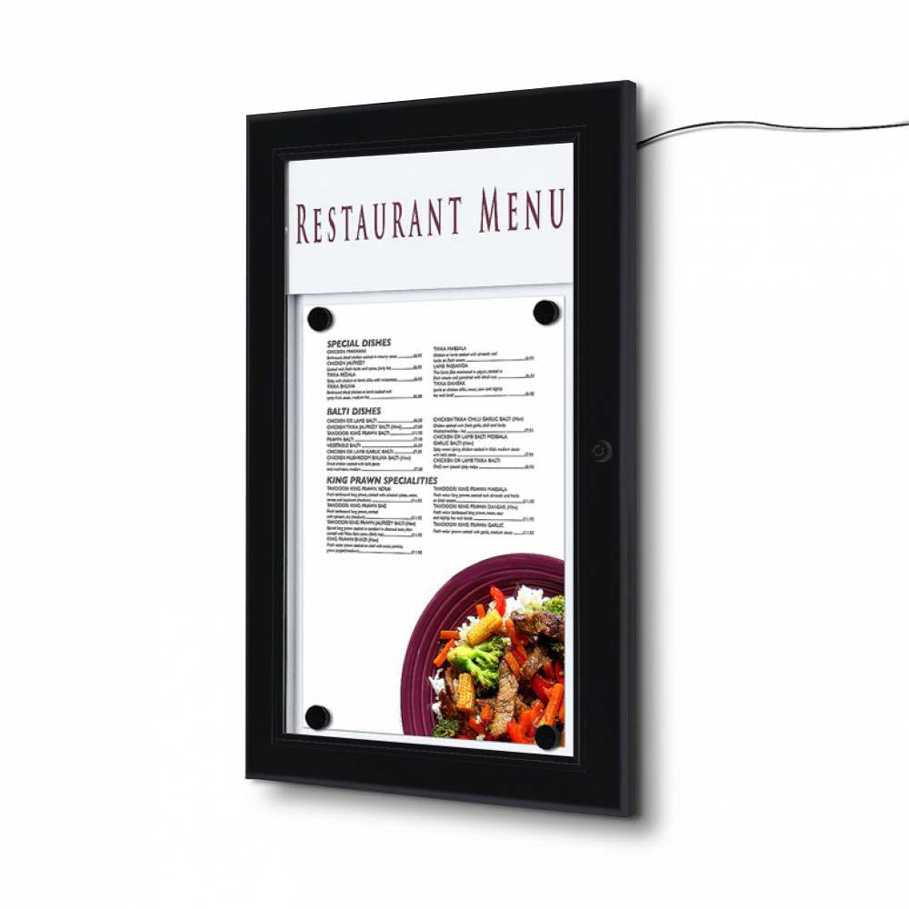 Uppmärksamma din meny med denna eleganta LED-menytavla! Denna svarta LED-meny display för väggmontering med en låsbar gångjärnskonstruktion. Lämplig för inomhus- och utomhusbruk. Perfekt att använda på restauranger, skolor, museum, butiker eller gym. Lys upp din information och dina broschyrer till och med mer med 12 / 24V LED-upplyst version! Använd de exponerade LED-remsorna och få extra uppmärksamhet och synlighet med denna snygga LED-tavla.