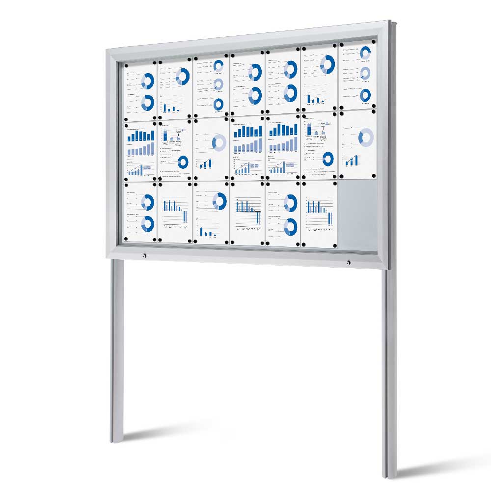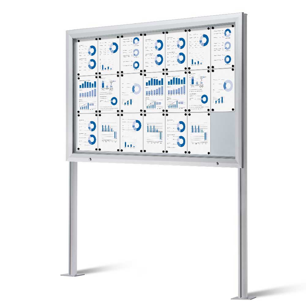 Låsbart skyltskåp för utomhusbruk med stolpar. Hög klass på väderskydd både ytskikt och tätning (för IP56). Vit lackerad stålplåt som bakstycke vilket gör att magneter går att använda. Informationstavlan är låsbart och nycklar medföljer.