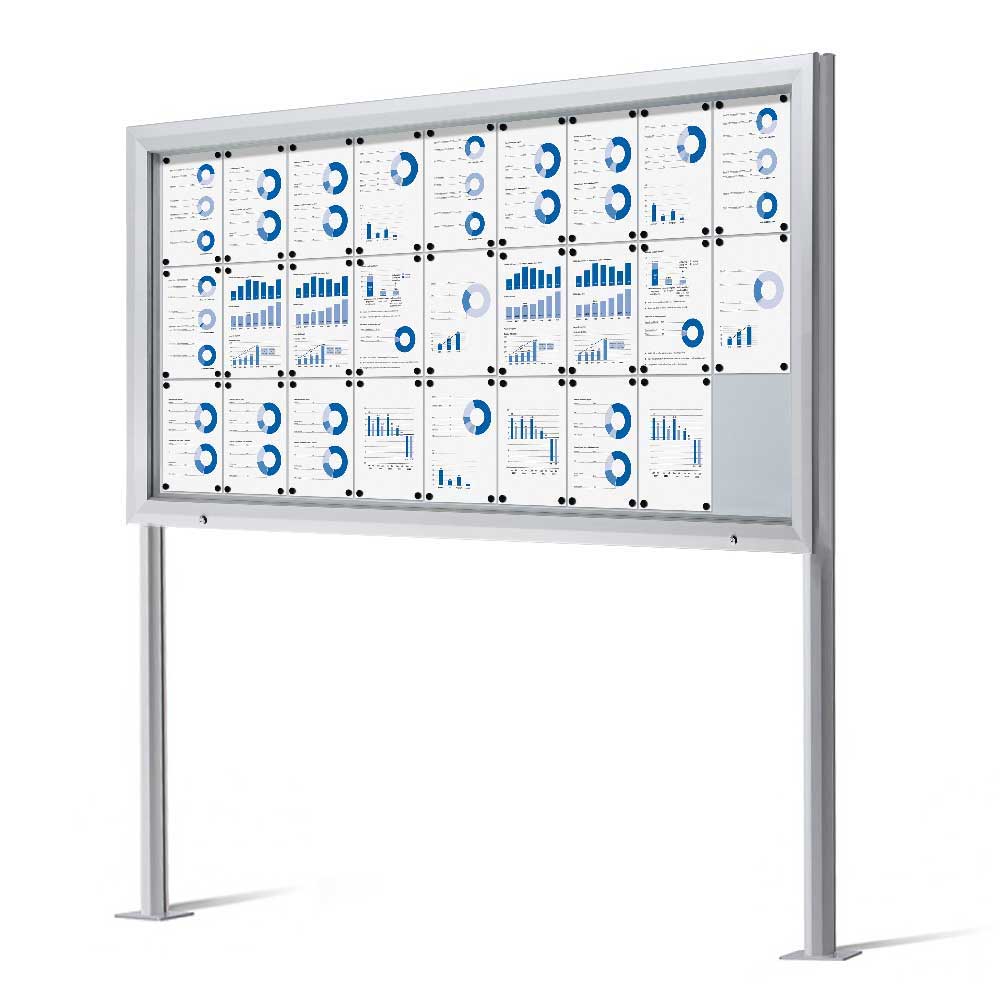Låsbart skyltskåp för utomhusbruk med stolpset. Hög klass på väderskydd både ytskick och tätning (för IP56). Vit lackerad stålplåt som bakstycke vilket gör att magneter går att använda. Informationstavlan är låsbart och nycklar medföljer.