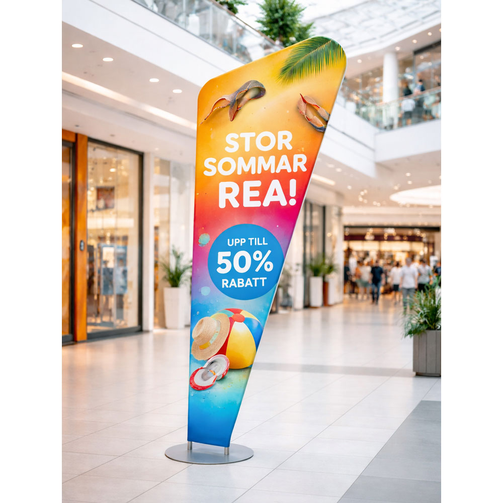 Fristående inomhusbanner i droppformat för display och exponering