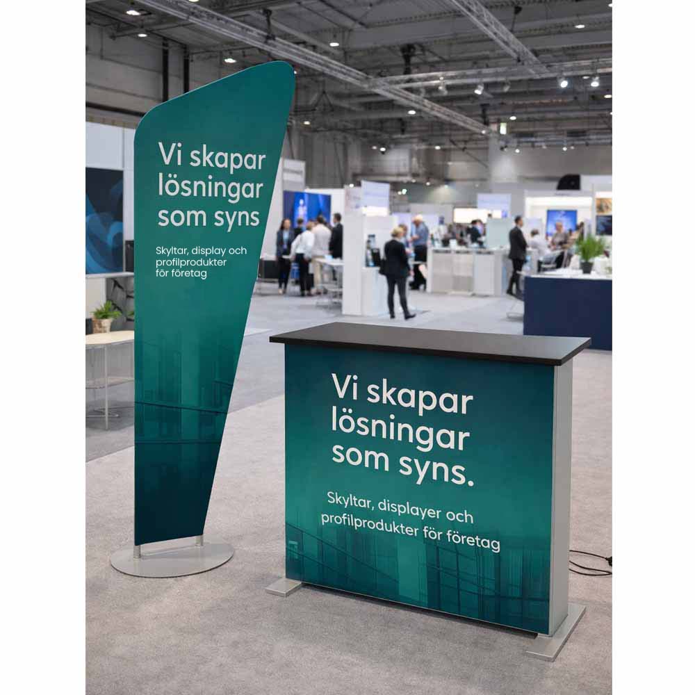 Denna fristående banner på droppformat stativ är avsedd för professionell exponering i inomhusmiljöer som mässor, konferenser, butiker och publika lokaler. Konstruktionen bygger på ett lätt stativ med ett textilöverdrag som ger ett slätt och stabilt resultat vid montering.
