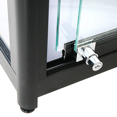 Färdigmonterad glasmonter med exklusiva aluminiumprofiler och tempererat glas av premiumkvalité gör detta glasskåp till en riktig vinnare. Vitrinskåpet har belysning som även denna är monterad och klar från fabrik som består av 3 st spotlights av LED på vardera sida samt belysning från det inre taket. 4 stycken 7 mm tjocka glashyllor gör att exponeringsmöjligheterna i denna glasvitrin är överlägsen och tack vare det härdade glaset kan även relativt tunga föremål exponeras på varje hyllplan. Lätt flyttbar tack vare de hjul som förankras med hjälp av fötterna som skruvas upp. Glasdörren är låsbar och med gångjärnen sitter till höger. En perfekt glasmonter för idrottsföreningens vinstpokaler eller varför inte till den exklusiva butikens mer kostsamma produkter.