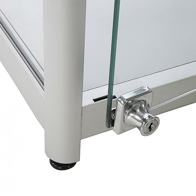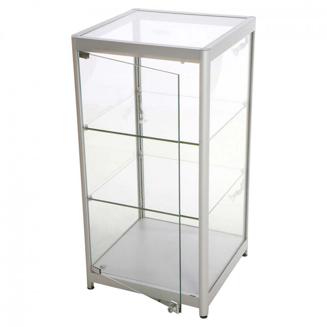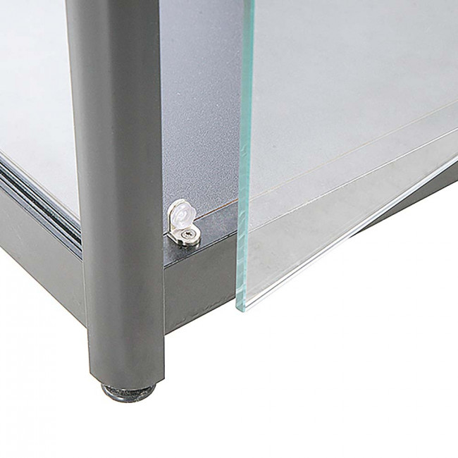 Stilrent monterskåp / glasskåp / vitrinskåp av hög kvalité. Vitrinskåpet består av aluprofiler och av härdat glas för att öka säkerheten och skydda föremålen som är placerade i glasskåpet. Detta vitrinskåp är ett så kallat showcase för visningar av mer exklusiva produkter och som kan vara stöldbegärliga. Showcase solo är ett låsbart vitrinskåp med 3 st spotlights LED för maximalt ljus. Skåpet är försett med fyra hjul och fixeras med hjälp av ställskruvar. Diskret strömbrytare innanför hörnet av glasmontern för enkel av/påslagning av belysningen.