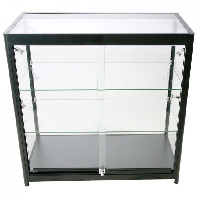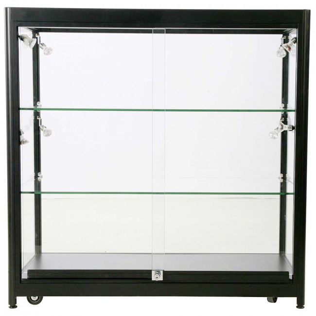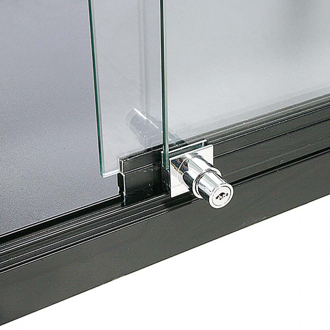 Stilren showcase med lås som levereras färdigmonterd och som är tillverkad av hög kvalité. Vitrinskåpet består av kraftiga snygga aluprofiler och av rejält härdat glas på både hyllplan och sidoglas. Detta skåp är en så kallad showcase och är framtagen för visningar av mer exklusiva produkter. Detta låsbara vitrinskåp är försett med spotlights av LED för bra belysning. Skåpet kan förflyttas tack var de fyra hjulen som är monterade på undersidan av glasskåpet och fixeras med hjälp av ställskruvar. Diskret strömbrytare innanför hörnet av glasmontern för att enkelt sätta igång ljuset samt för att lätt stänga av desamma.